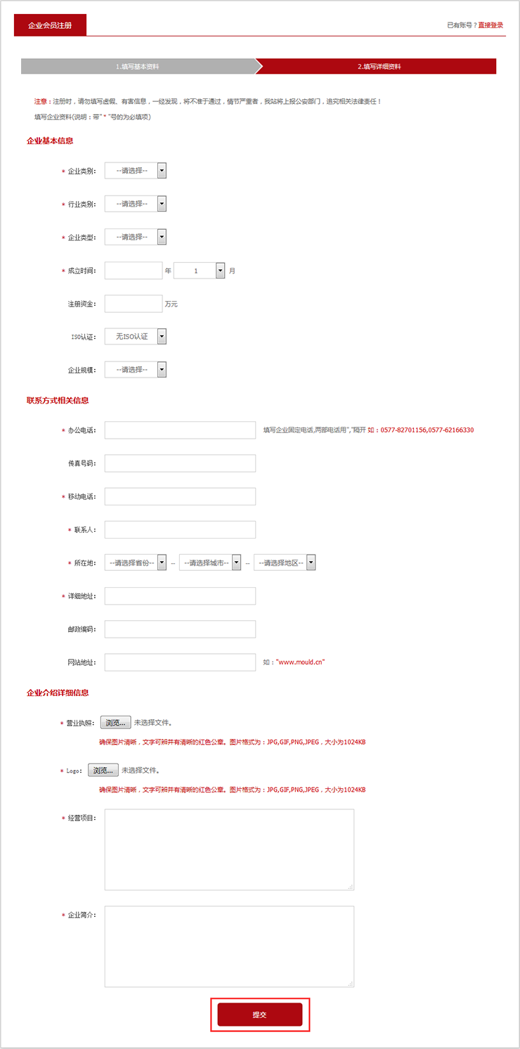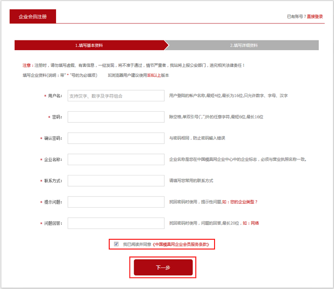 第三步:认真阅读《中模网企业会员服务条款》并填写完基本信息后,点击"下一步"